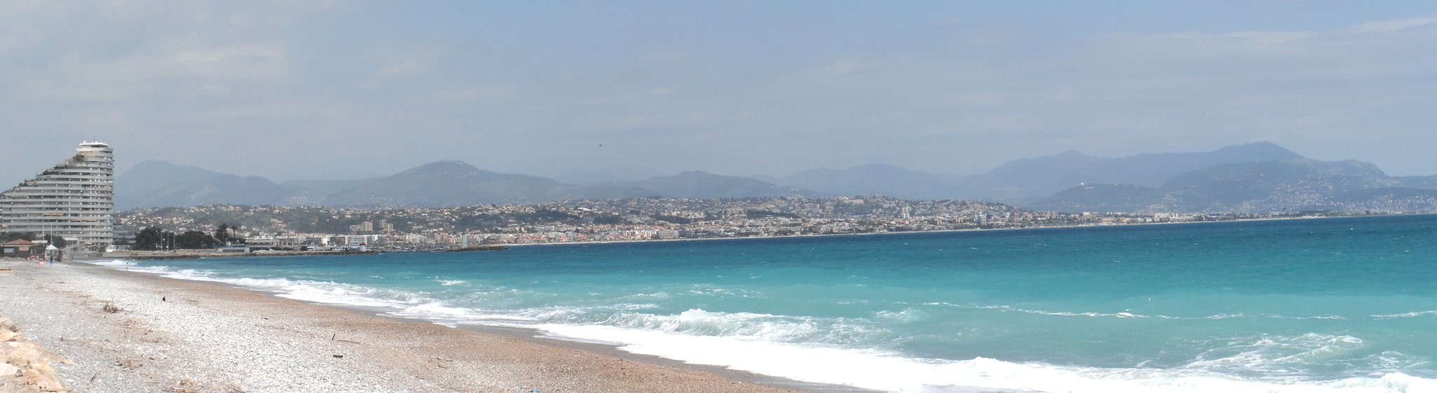 A gauche Villeneuve Loubet et sa marina, au centre, Cagnes et St Laurent du Var, à droite Nice et Villefranche sur mer :